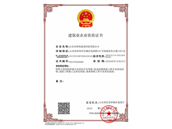 山東雙得利建設(shè)科技有限公司是一家集科研、工程技術(shù)開發(fā)、咨詢、工程結(jié)構(gòu)加固改造檢測、設(shè)計、施工于一體的綜合性、專業(yè)化企業(yè)。公司注冊資金5001萬元,具備建筑工程施工總承包貳級、主體結(jié)構(gòu)工程檢測、特種工程結(jié)構(gòu)補(bǔ)強(qiáng)專業(yè)承包不分等級、地基基礎(chǔ)工程專業(yè)承包貳級、防水防腐保溫工程專業(yè)承包貳級、施工勞務(wù)不分等級資質(zhì)。現(xiàn)有高素質(zhì)人才126人,其中高級工程師6人,一級注冊結(jié)構(gòu)工程師2人,一級注冊建造師3人,一級注冊造價師2人,注冊監(jiān)理工程師2人,二級注冊結(jié)構(gòu)工程師4人,二級注冊建造師10人,中級工程師30余人,其他專業(yè)技術(shù)人員30余人。公司所有工程技術(shù)人員均從事工程施工行業(yè)多年。